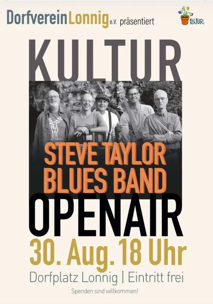 Auftritt beim Kultur Open Air Lonnig Festival am 30. AugustZuletzt aktualisiert am Mai 28, 2024 1 min Lesezeit Image credit: https://unsplash.com/photos/grey-and-black-pa-speakers-near-electric-guitar-and-drum-1t0yY9lSpyE?Wir sind am 30. August beim Kultur Open Air in Lonnig! Weitere Infos folgenSteve Taylor Blues BandWir sind eine Blues Band aus dem Rhein-Mosel Delta (Koblenz).
